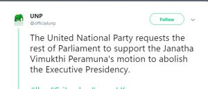 ජනතා විමුක්ති පෙරමුණ විසින් විධායක ජනපතිධූරය අහෝසි කිරිම සඳහා ගෙන ආ යෝජනාවට සහාය ලබාදෙන බව එක්සත් ජාතික පක්ෂය පවසයි.