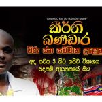 මගීන් පිරිසකගේ ජීවිත බේරා ගැනීම සදහා සිය දිවිය කැප කළ රියදුරු කීර්ති බණ්ඩාර සමරමින් සංවිධාන කෙරෙන ‘‘කීර්ති බණ්ඩාර විරුජන සම්මාන’’ පිරිනැමීමේ වැඩසටහන අද පස්වරුවේ කොළඹ 07 ශී්ර ලංකා පදනම් ආයතනයේදී පැවැත්නාවෙන බව නායකත්ව පුහුණු උපදේශක උදයා දේවාමුල්ල මහතා පවසයි. බෙරගල ප්රදේශයේ පල්ලමකදී තමන් ප...